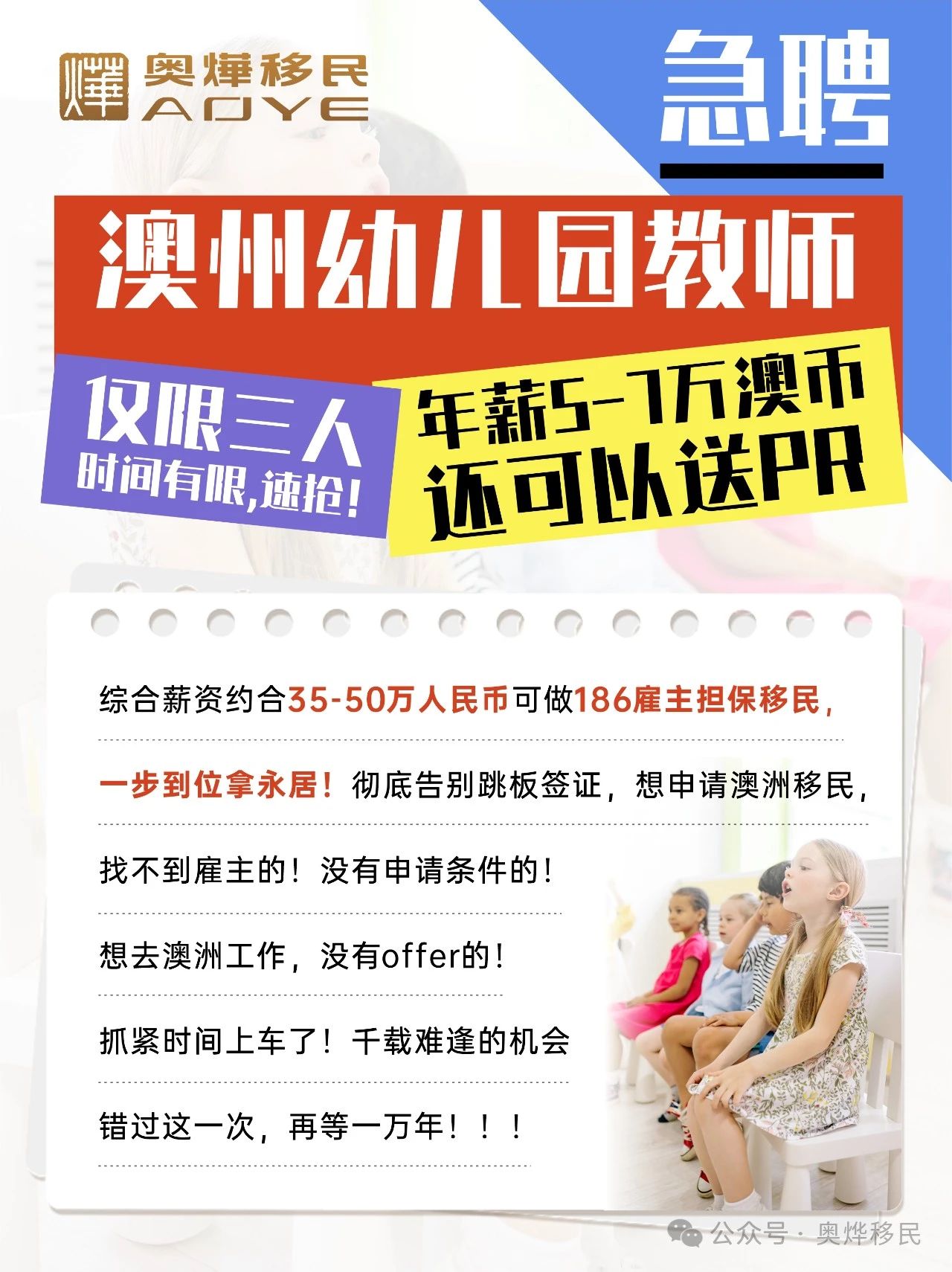 年薪5-7萬澳幣(人民幣35-50萬),可做186雇主擔保移民,一步到位全家拿身份!