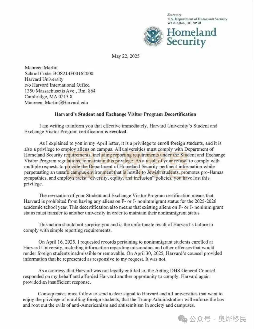 當地時間5月22日,一封由美國國土安全部部長克里斯蒂·諾姆簽署的公函,將哈佛大學推上輿論風暴眼。這封被曝光的文件明確寫道:“即日起撤銷哈佛大學學生和交流訪問學者項目(SEVP)認證資格,2025-2026學年起,該校不得招收任何持F-1學生簽證或J-1交流訪問簽證的外籍學生。”