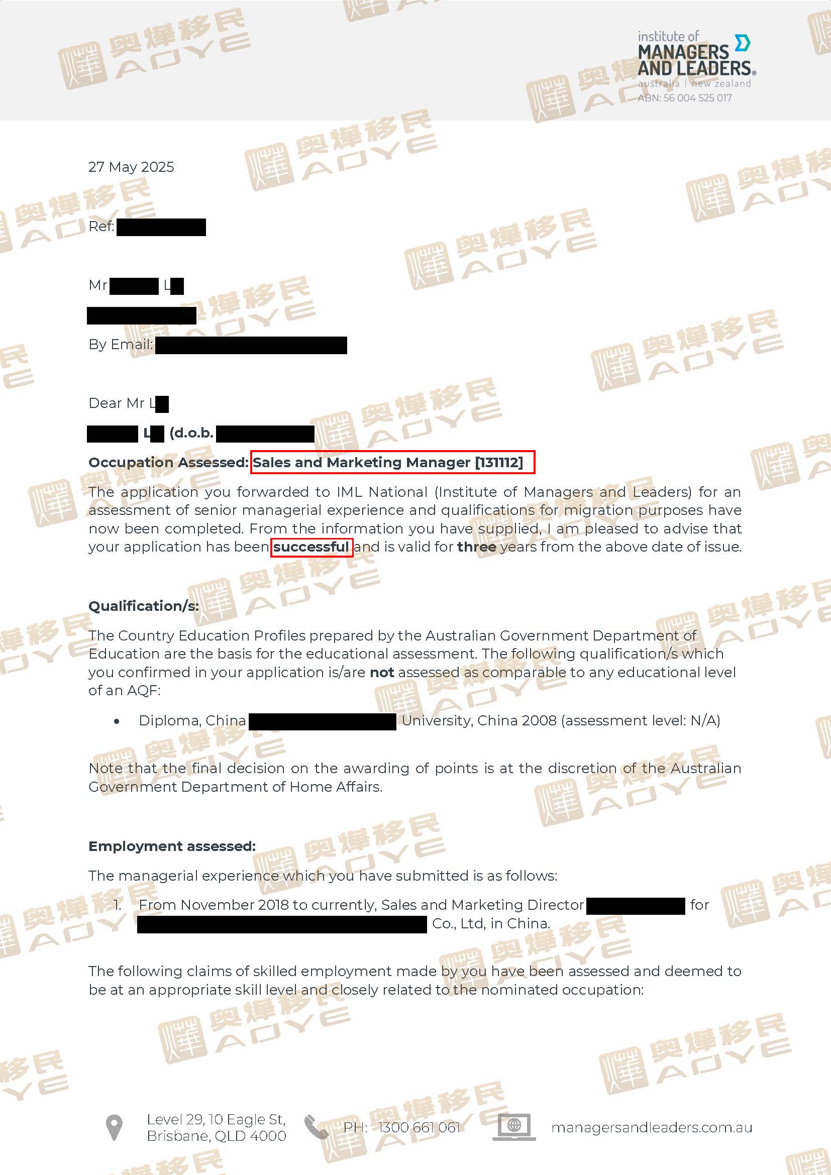 喜訊:186L總通過職業評估,提名職位:銷售與市場經理,4月30日遞交(快速通道),5月27日職評通過。L總工作背景較為復雜,但文案同事l與客戶進行了多次溝通和梳理,清晰地為L總展示了其在銷售與市場相關的管理職能,最終職評通過。