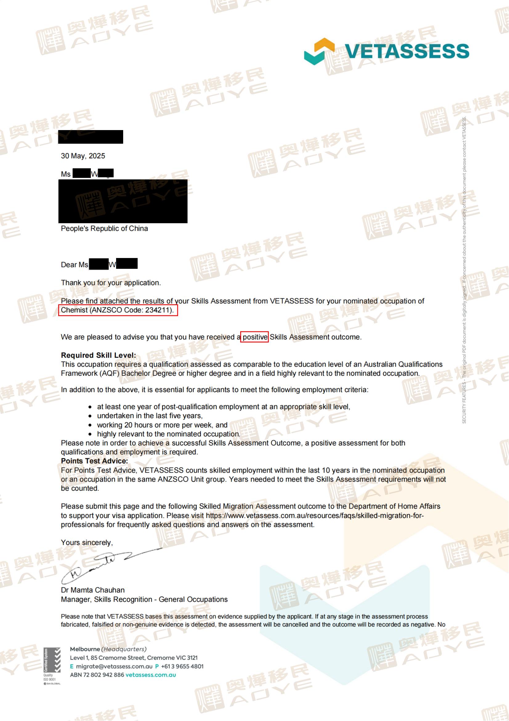 喜訊:186W女士通過職業評估,提名職位:化學家,5月21日遞交(快速通道),5月30日職評通過。