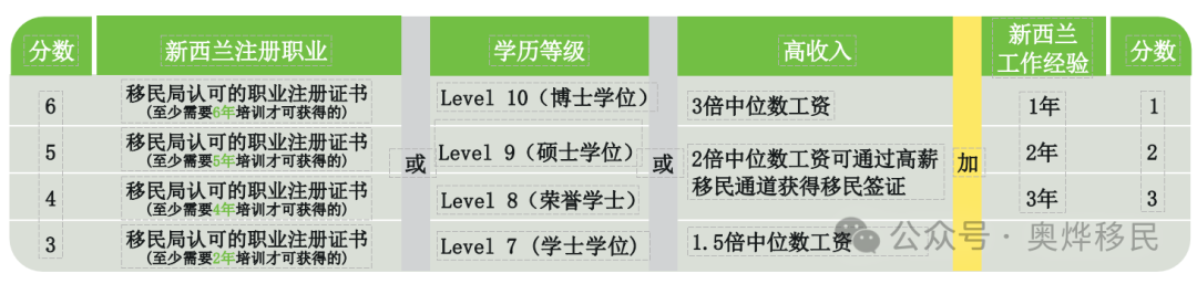 e.評分制度:滿足“六分制”標準——這六分的組成來源于注冊職業培訓、學歷、收入(三選一)加上新西蘭本地技能工作。