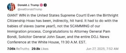 美國時間6月27日,美國最高法院以6票贊成、3票反對的表決結果,批準特朗普政府針對“出生公民權”的行政令在全美在未起訴的28個州臨時生效。