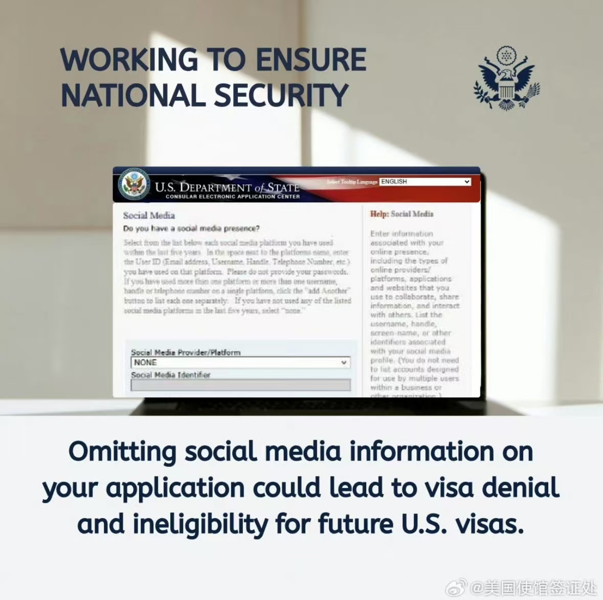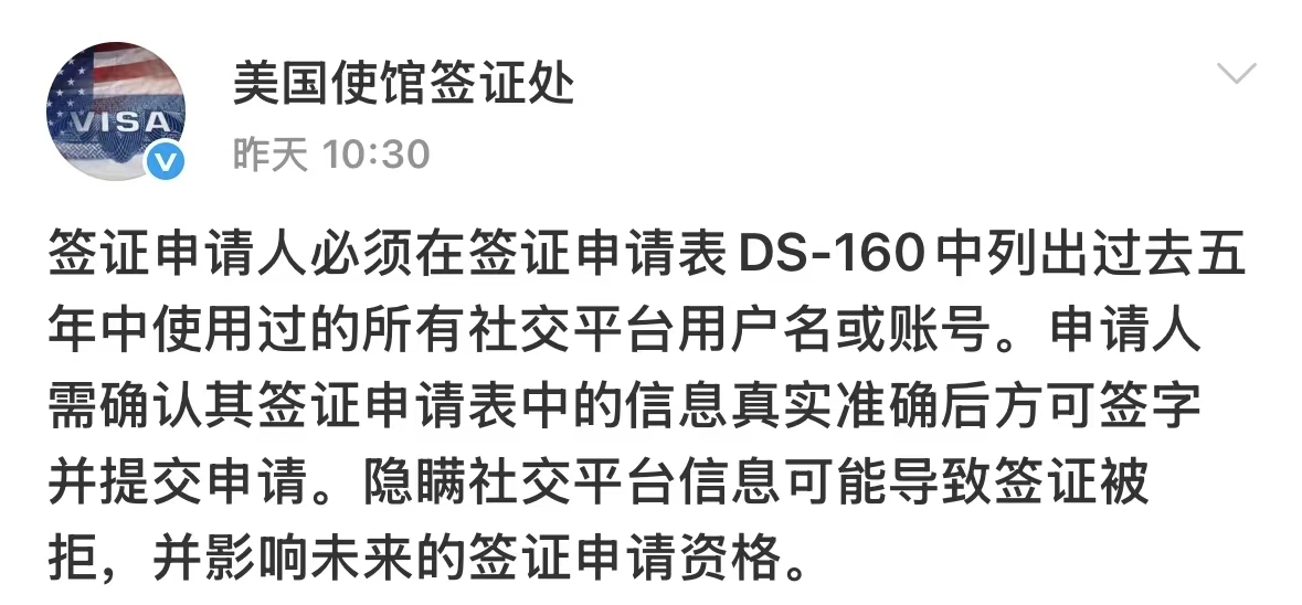 美國B類簽證申請,又出新規:要求申請人必須在簽證申請表DS-160中列出,過去五年中使用過的所有社交平臺用戶名或賬號。