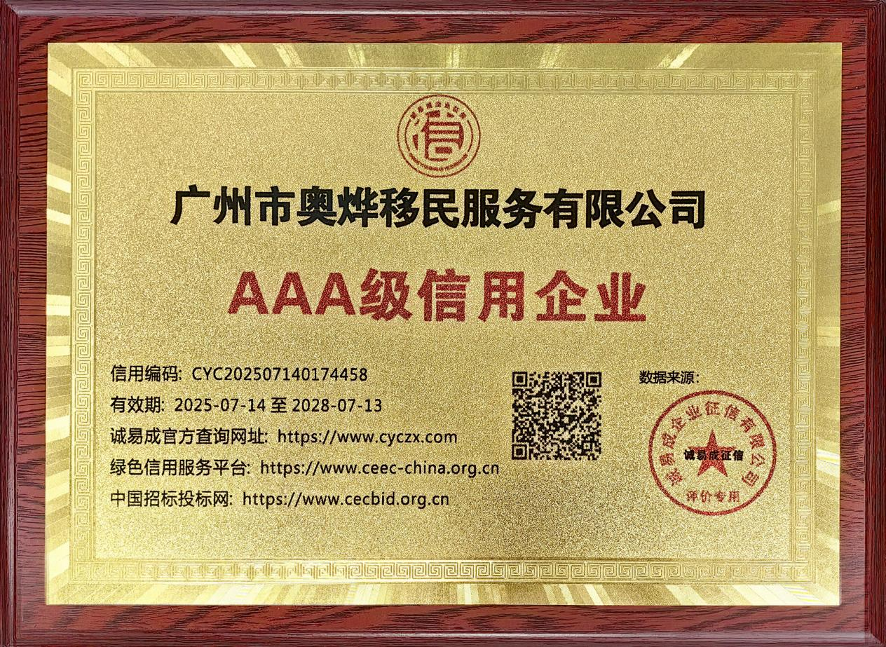 近日,奧燁移民榮獲權威征信機構——誠易成征信頒發的“企業信用評價報告”最高等級AAA級認證,全面取得“12證1牌1報告”完整企業信用體系榮譽。這一系列認證充分彰顯了奧燁移民在誠信建設、規范經營和社會責任等方面的優異表現,也標志著其在移民服務領域的專業實力與行業地位又一次獲得權威肯定。
