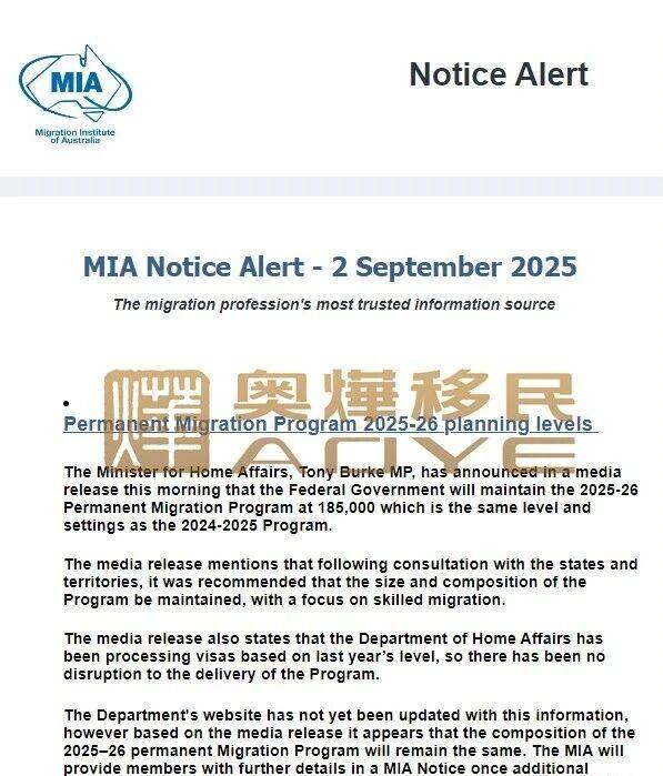 澳大利亞移民協會(MIA)最新發布消息!澳大利亞聯邦政府正式確認,2025–26財年的永久移民計劃(Permanent Migration Program)年度配額上限仍為18.5萬個!