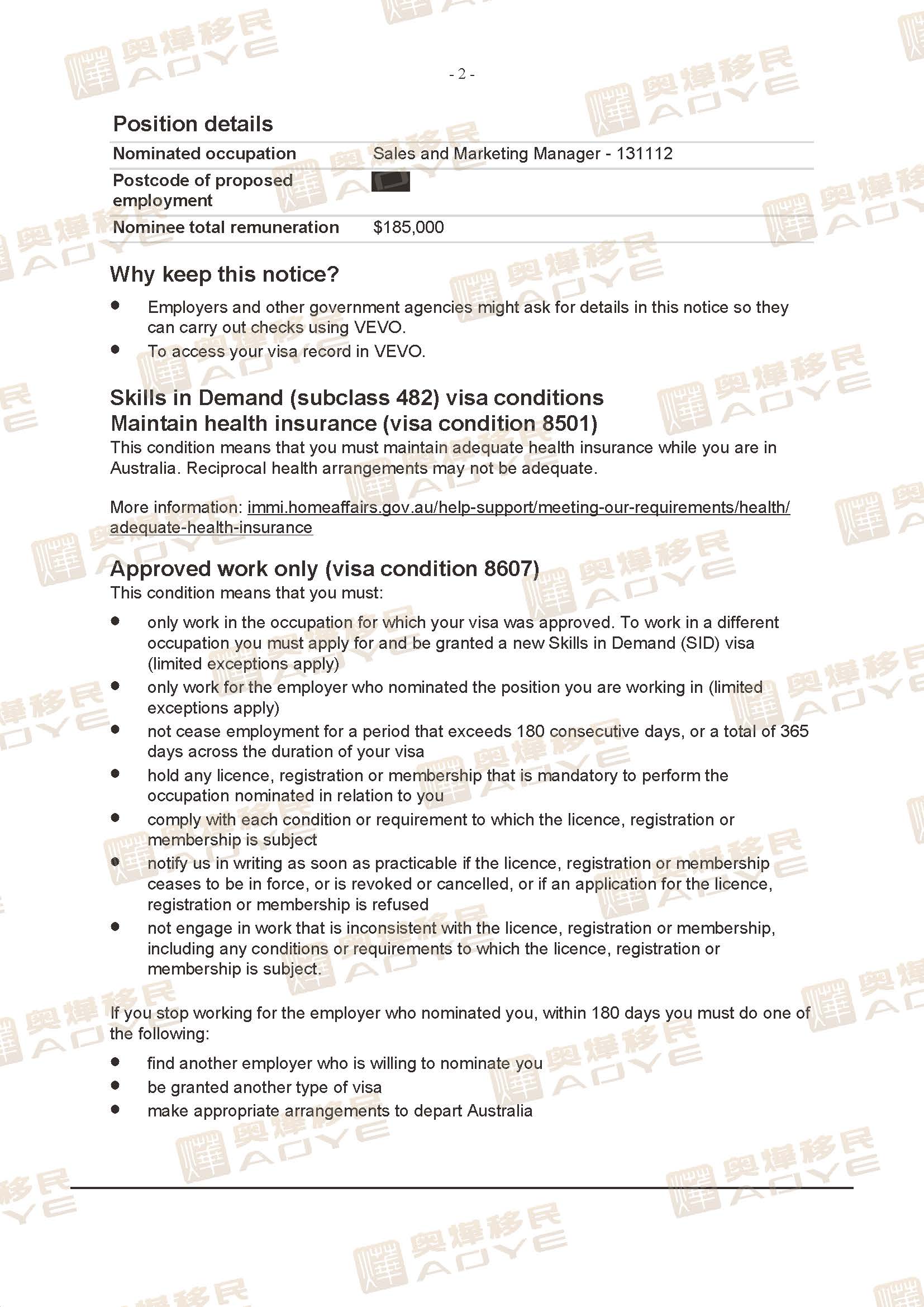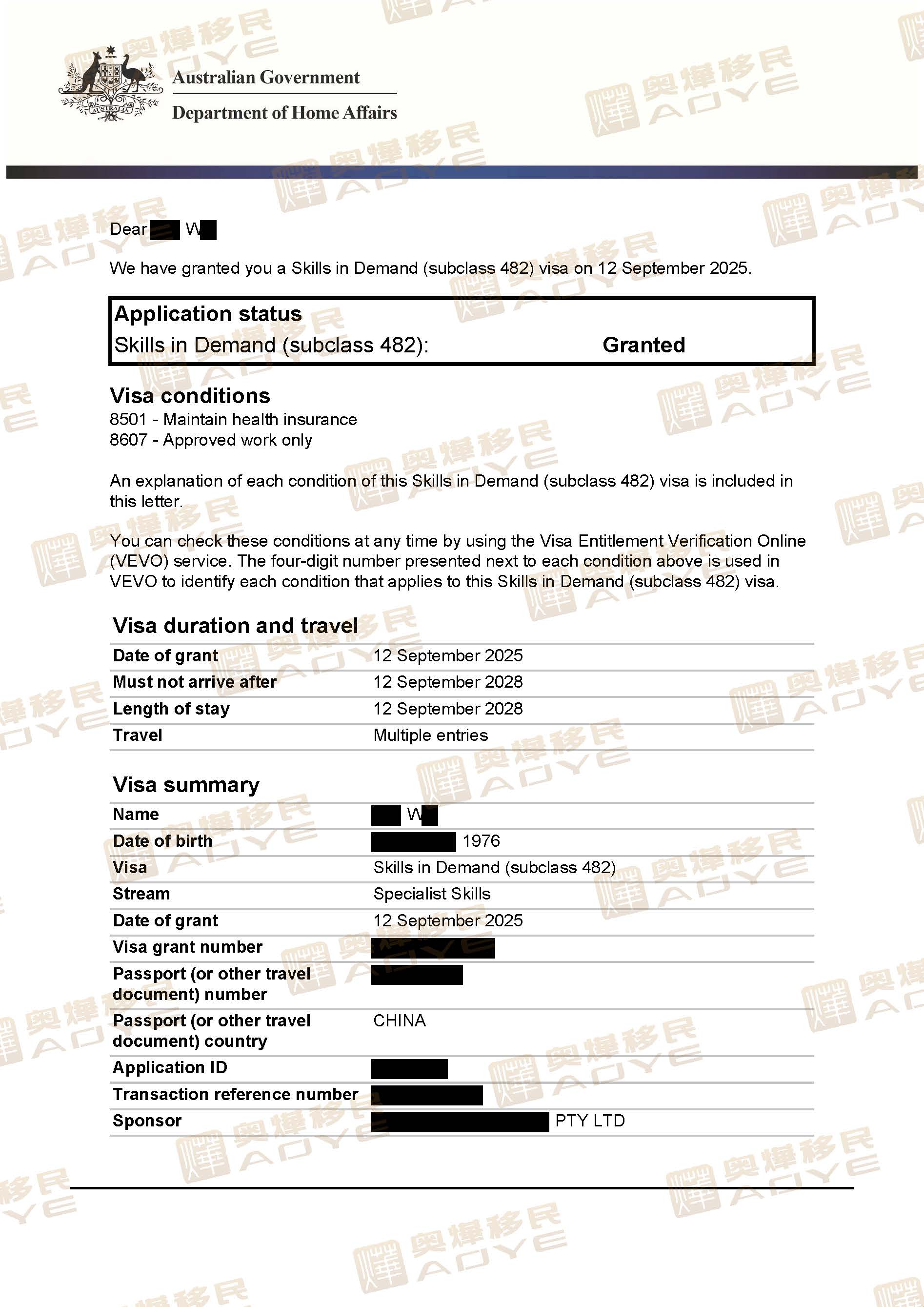 喜訊:W女士SID簽證獲批!提名職位Sales and Marketing Manager(銷售及營銷經理),年薪18.5萬澳幣。能夠如此順利和快速獲批高薪職位的提名和簽證,不僅充分體現了澳洲企業實力,也體現了申請材料的專業呈現