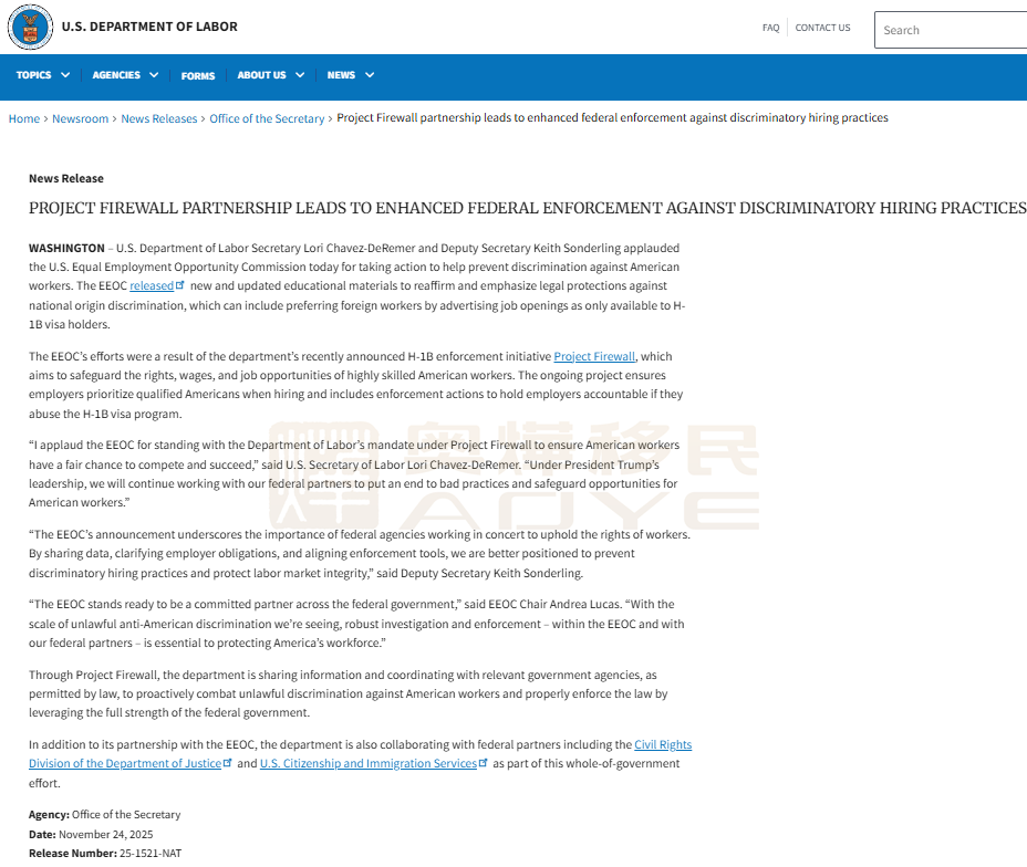 11月25日,美國勞工部發布了一則與H-1B簽證相關的新聞。
