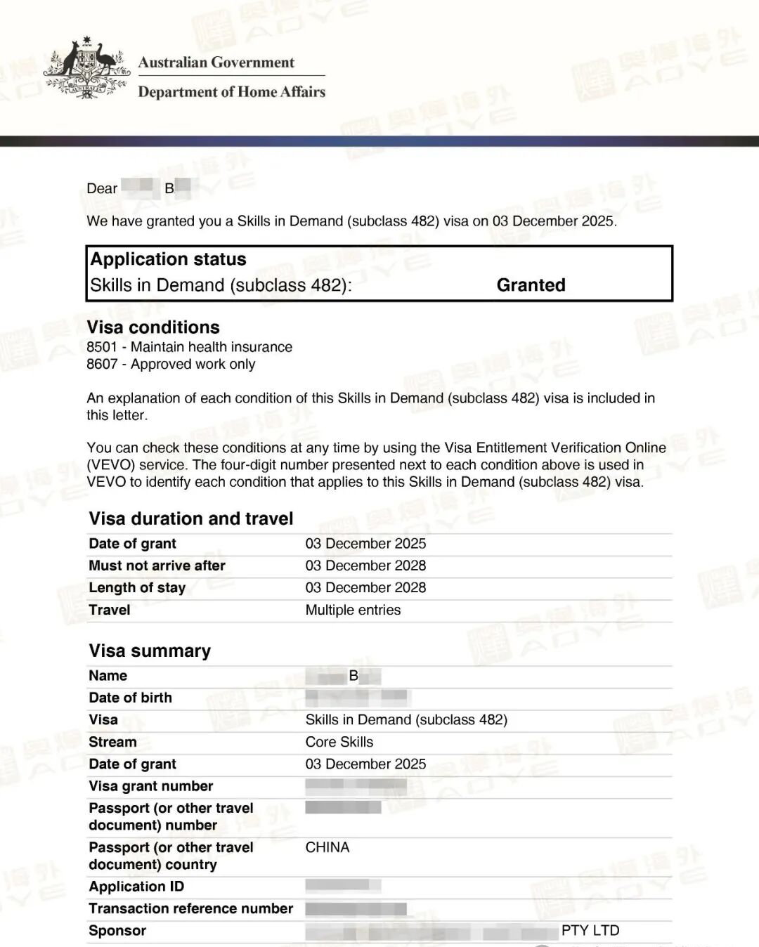 Congratulation!恭喜奧燁澳洲SID 482客戶B總成功獲批!