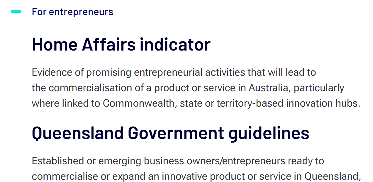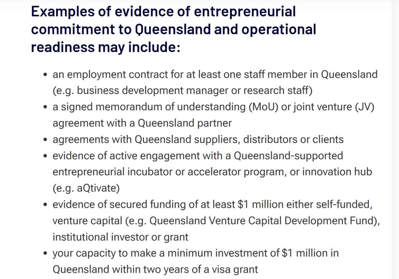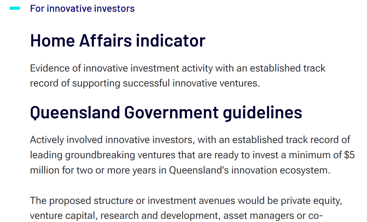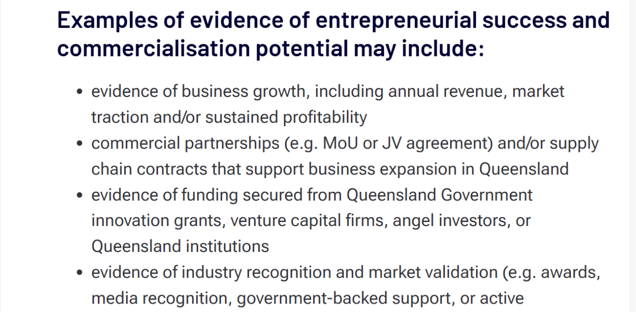 已在昆士蘭州建立或正嶄露頭角的企業主/創業者,準備將一項創新性的產品或服務推向市場或進行擴展,且具備至少100萬澳幣的最低投資門檻。