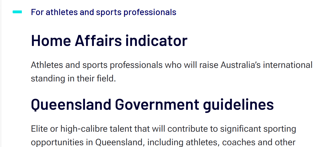 能夠為昆州帶來重大體育機遇的精英或高素質人才,包括運動員、教練和其他體育專家(如運動科學家)。