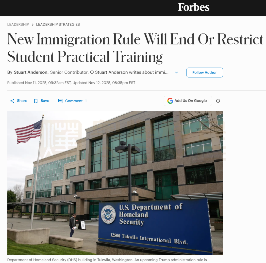 官網截圖:https://www.forbes.com/sites/stuartanderson/2025/11/11/new-immigration-rule-will-end-or-restrict-student-practical-training/?ctpv=searchpage
