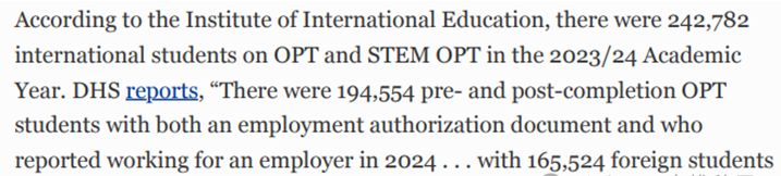 而美國國土安全部數據顯示,2024年有超過50萬條SEVIS記錄顯示學生已獲得參加OPT的授權。