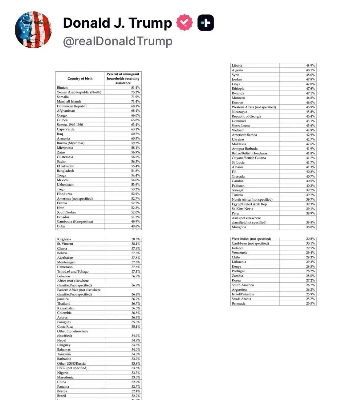 當地時間1月4日,美國總統特朗普在社交平臺公布了一份涉及近120個國家的“移民福利領取率”圖表。