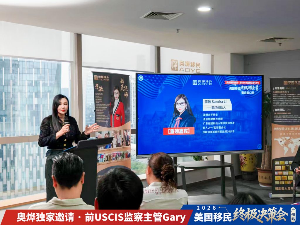 2026年4月14日,春滿羊城,機遇云集。由奧燁移民主辦的「2026美國移民終極決策分享會」在廣州總部盛大啟幕。本次活動以美國EB-5投資移民為絕對核心,聚焦當前美國移民政策變局、EB-5雙遞交窗口期、優質項目甄選等關鍵議題,匯聚了前USCIS監察主管、美國EB-5認證律師、美國項目方高管等權威陣容,吸引了30余組高凈值家庭、行業精英親臨現場,線上直播通道同步開啟,全網關注熱度持續攀升。