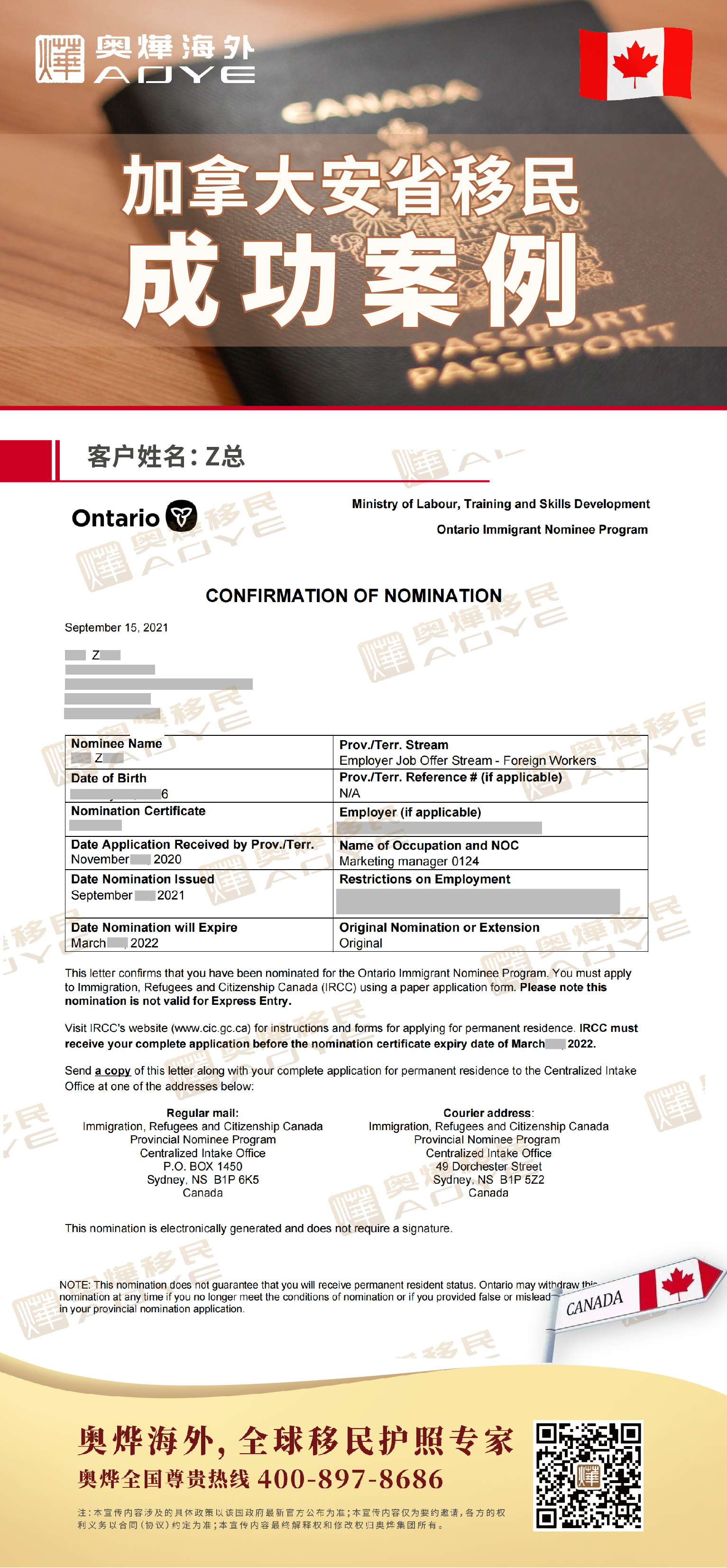 【重磅喜報】:奧燁加拿大安省雇主項目成功案例 客戶免雅思省提名快速獲批 職位:市場經理 簽約一個月內成功匹配企業 EOI新政語言學歷不計分,受邀分數低,審理速度快,趕緊抓住免雅思機會全家抵達加拿大