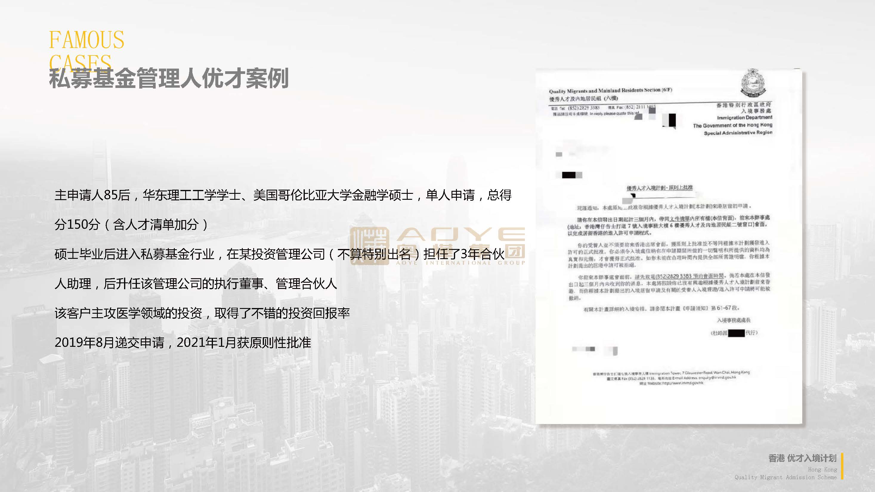 主申請人85后,華東理工工學學士、美國哥倫比亞大學金融學碩士,單人申請,總得分150分(含人才清單加分)。碩士畢業后進入私募基金行業,在某投資管理公司(不算特別出名)擔任了3年合伙人助理,后升任該管理公司的執行董事、管理合伙人該客戶主攻醫學領域的投資,取得了不錯的投資回報率! 2019年8月遞交申請,2021年1月獲原則性批準
