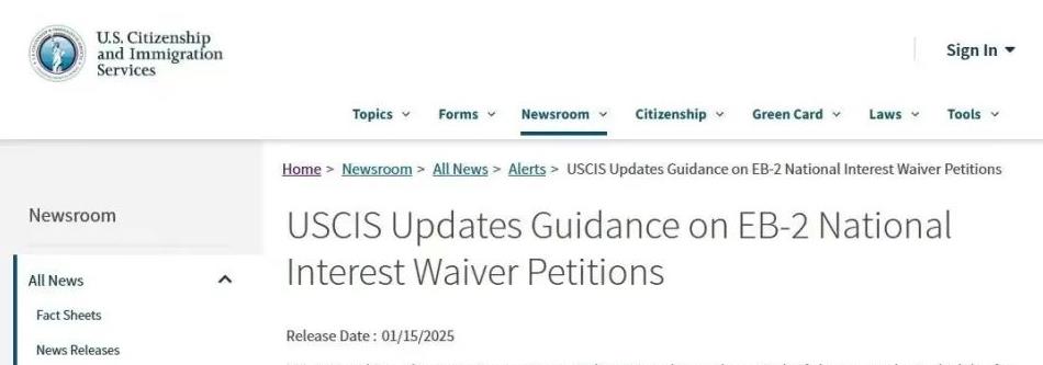 🇺🇸通知:美國移民局于2025年1月15日對NIW政策做出重大調整與補充,立即生效,具體調整如下: 1. 提高了對于...