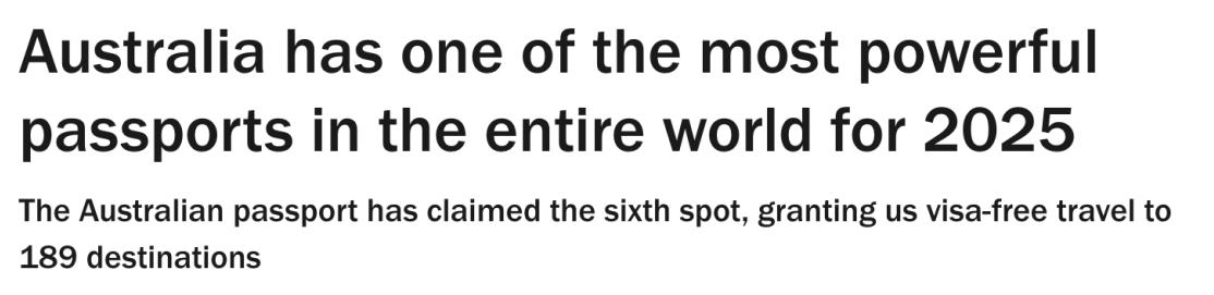好消息!2025年澳洲的小藍本Passport再次被評為全球蕞強大的身份之一排名第六!讓澳洲人可以輕松免簽證前往全球227個目的地中...