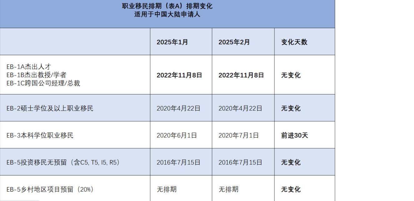 剛剛,美國國務院更新了2025年02月,職業移民中基本沒啥變化,只有 EB3 迎來了小幅前進!好消息是EB-5預留簽證項目繼續無排期...