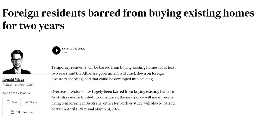 Part 1 4月起澳洲全面禁止海外人士買現房房屋空置要收稅 自2025年4月1日至2027年3月31日,海外投資者將被禁止購買澳洲已建成...