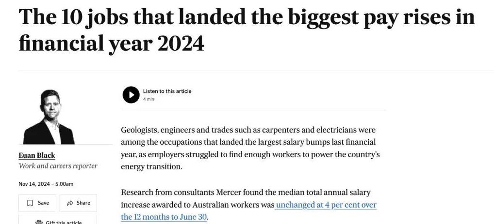 澳洲公布2024財年薪資漲幅蕞高的10個職業! 該數據基于近1300家澳大利亞公司(雇傭了超過 444,000 名員工)的數據。 澳洲媒體...